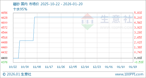 1月20日,生意社硼砂基准价为4633.33元/吨,与本月初持平。