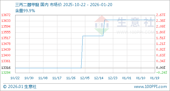 1月20日,生意社三丙二醇甲醚基准价为13640.00元/吨,与本月初持平。