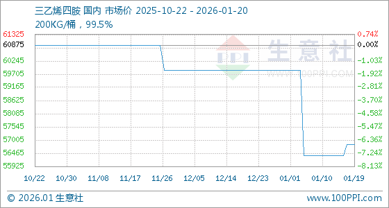 1月20日,生意社三乙烯四胺基准价为56833.33元/吨,与本月初(59875.00元/吨)相比,下降了5.08%。