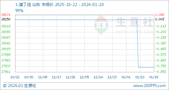 1月20日,生意社1-溴丁烷基准价为27933.33元/吨,与本月初(28150.00元/吨)相比,下降了0.77%。