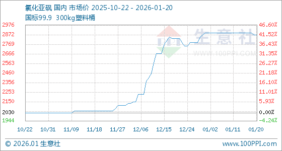 1月20日,生意社氯化亚砜基准价为2870.00元/吨,与本月初(2890.00元/吨)相比,下降了0.69%。