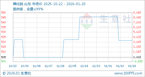 1月20日,生意社碘化钠基准价为522.50元/千克,与本月初(546.67元/千克)相比,下降了4.42%。