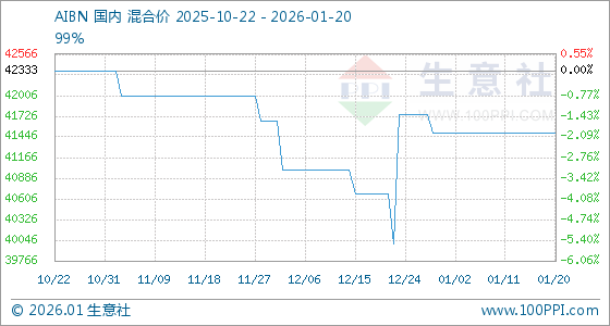 1月20日,生意社AIBN基准价为41500.00元/吨,与本月初持平。