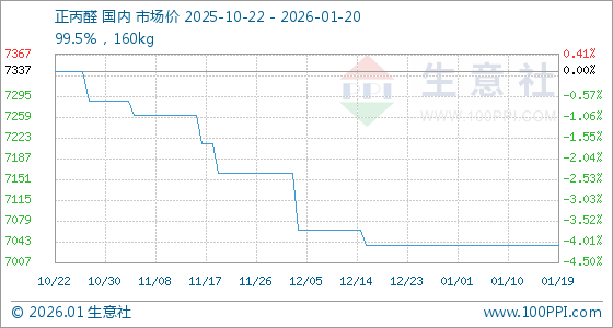 1月20日,生意社正丙醛基准价为7037.50元/吨,与本月初持平。