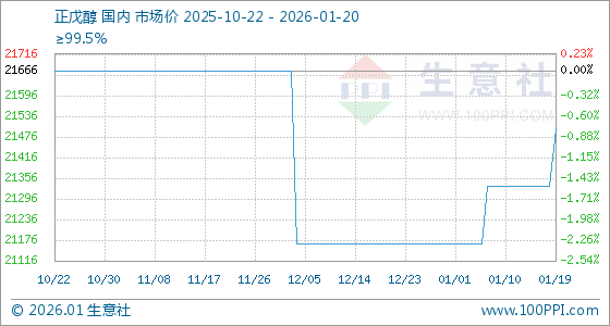 1月20日,生意社正戊醇基准价为21500.00元/吨,与本月初(21166.67元/吨)相比,上涨了1.57%。