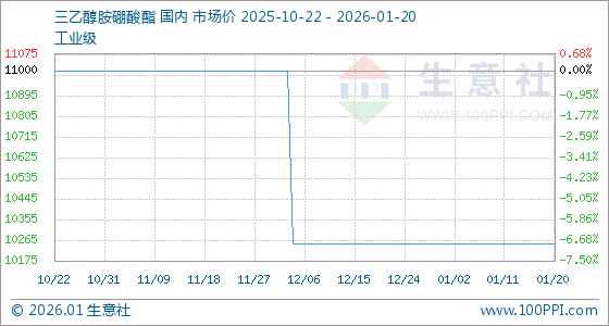 1月20日,生意社三乙醇胺硼酸酯基准价为10250.00元/吨,与本月初持平。