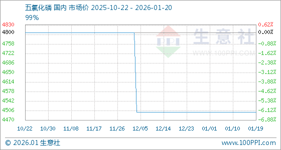 1月20日,生意社五氯化磷基准价为4500.00元/吨,与本月初持平。