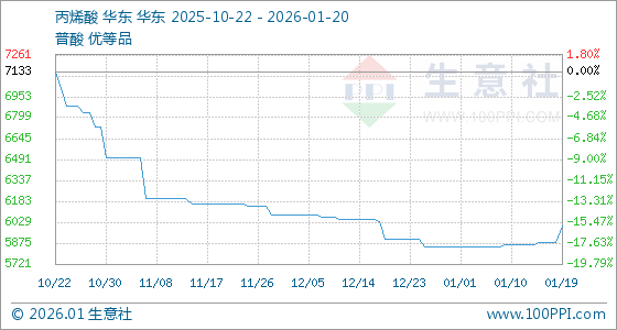 1月20日,生意社丙烯酸基准价为6000.00元/吨,与本月初(5850.00元/吨)相比,上涨了2.56%。