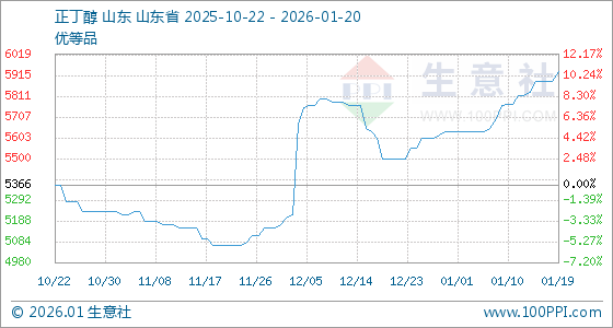 1月20日,生意社正丁醇(工业级)基准价为5933.33元/吨,与本月初(5633.33元/吨)相比,上涨了5.33%。