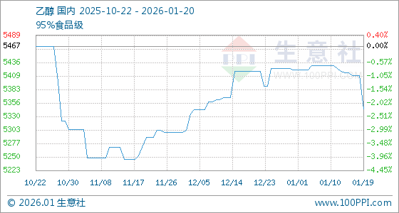 1月20日,生意社乙醇基准价为5344.45元/吨,与本月初(5421.11元/吨)相比,下降了1.41%。