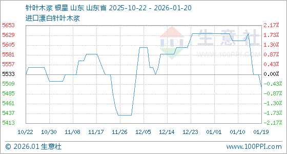 1月20日,生意社针叶木浆基准价为5500.00元/吨,与本月初(5633.33元/吨)相比,下降了2.37%。
