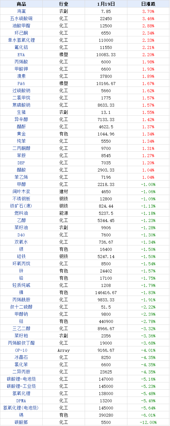 据生意社价格监测,2026年1月19日大宗商品价格涨跌榜中环比上升的商品共51种,集中在化工板块(共36种)和农副板块(共6种),涨幅前3的商品分别为鸡蛋(3.70%)、五水硫酸铜(3.46%)、油酸甲酯(2.88%)。 环比下降的商品共92种,集中在化工(共40种)和橡塑(共12种),跌幅在5%以上的商品主要集中在化工板块;跌幅前3的商品分别为碳酸胍(-12.00%)、锡(-6.01%)、氢氧化锂(电池级)(-5.64%)。