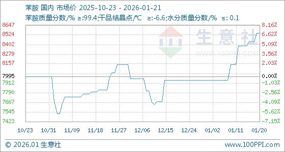 1月21日,生意社苯胺基准价为8545.00元/吨,与本月初(7945.00元/吨)相比,上涨了7.55%。