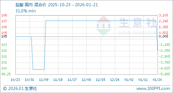 1月21日,生意社盐酸基准价为102.50元/吨,与本月初(107.50元/吨)相比,下降了4.65%。