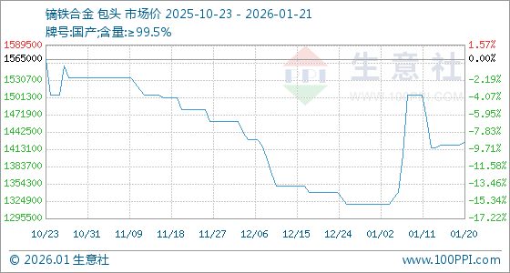 1月21日,生意社镝铁合金基准价为1425000.00元/吨,与本月初(1320000.00元/吨)相比,上涨了7.95%。