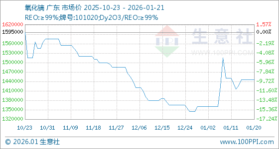 1月21日,生意社氧化镝基准价为1445000.00元/吨,与本月初(1360000.00元/吨)相比,上涨了6.25%。