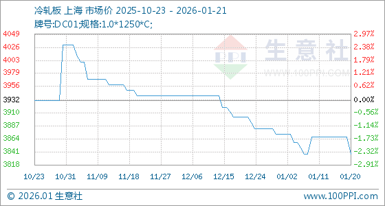 1月21日,生意社冷轧板基准价为3837.50元/吨,与本月初(3872.50元/吨)相比,下降了0.9%。