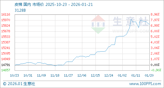 1月21日,生意社皮棉基准价为15864.17元/吨,与本月初(15549.17元/吨)相比,上涨了2.03%。