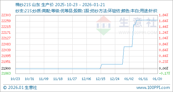 1月21日,生意社棉纱21S基准价为22266.67元/吨,与本月初(22066.67元/吨)相比,上涨了0.91%。