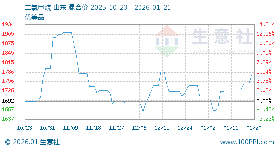1月21日,生意社二氯甲烷基准价为1767.50元/吨,与本月初(1697.50元/吨)相比,上涨了4.12%。