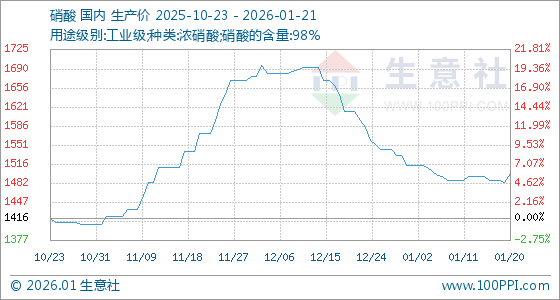 1月21日,生意社硝酸基准价为1500.00元/吨,与本月初(1513.33元/吨)相比,下降了0.88%。