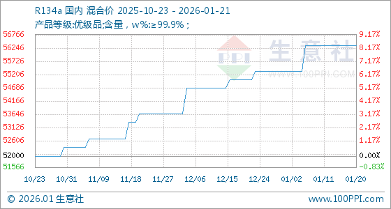 1月21日,生意社R134a基准价为56333.33元/吨,与本月初(55333.33元/吨)相比,上涨了1.81%。