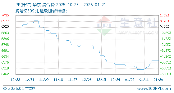 1月21日,生意社PP(纤维)基准价为6600.00元/吨,与本月初(6535.00元/吨)相比,上涨了0.99%。