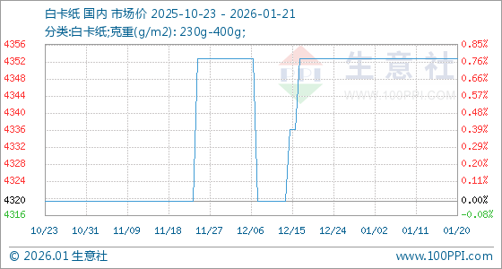1月21日,生意社白卡纸基准价为4353.33元/吨,与本月初持平。