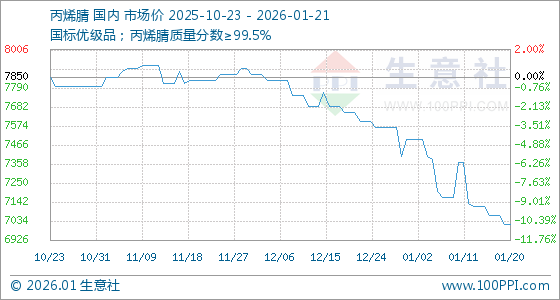 1月21日,生意社丙烯腈基准价为7016.67元/吨,与本月初(7500.00元/吨)相比,下降了6.44%。