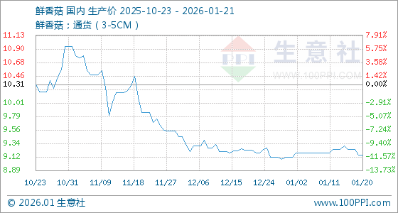 1月21日,生意社鲜香菇基准价为9.15元/公斤,与本月初(9.11元/公斤)相比,上涨了0.44%。