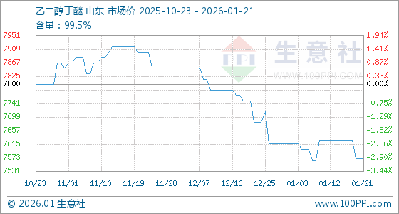 1月21日,生意社乙二醇丁醚基准价为7571.43元/吨,与本月初(7616.67元/吨)相比,下降了0.59%。