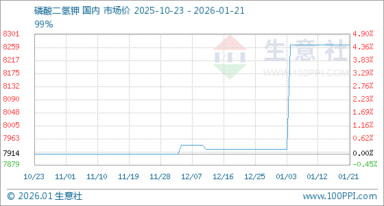 1月21日,生意社磷酸二氢钾基准价为8266.67元/吨,与本月初(7928.57元/吨)相比,上涨了4.26%。