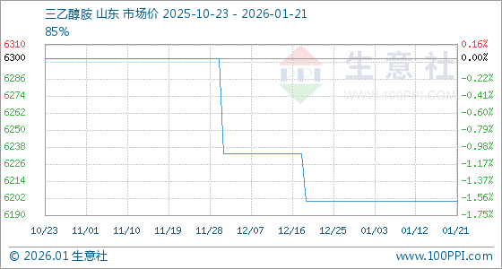 1月21日,生意社三乙醇胺基准价为6200.00元/吨,与本月初持平。
