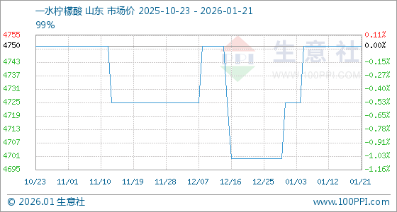 1月21日,生意社一水柠檬酸基准价为4750.00元/吨,与本月初(4725.00元/吨)相比,上涨了0.53%。