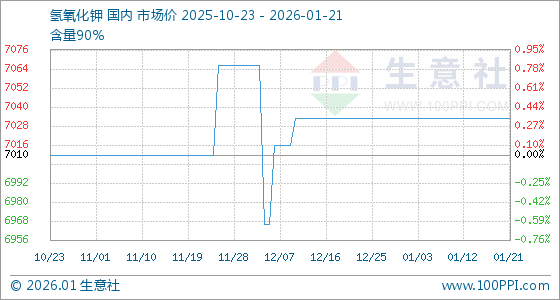 1月21日,生意社氢氧化钾基准价为7033.33元/吨,与本月初持平。