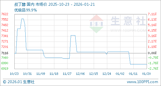 1月21日,生意社叔丁醇基准价为6978.57元/吨,与本月初(7141.67元/吨)相比,下降了2.28%。