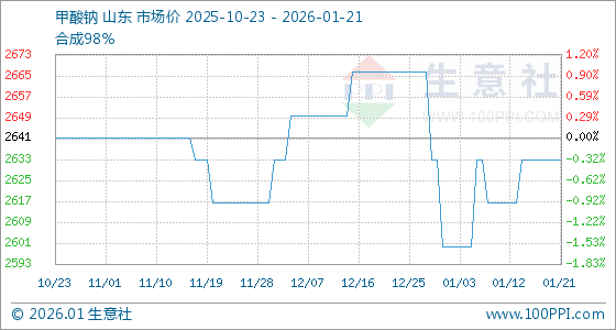 1月21日,生意社甲酸钠基准价为2633.33元/吨,与本月初(2600.00元/吨)相比,上涨了1.28%。