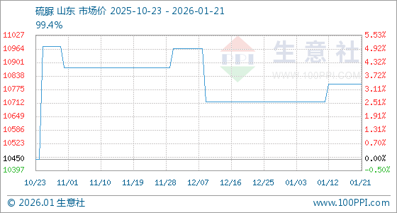 1月21日,生意社硫脲基准价为10800.00元/吨,与本月初(10716.67元/吨)相比,上涨了0.78%。
