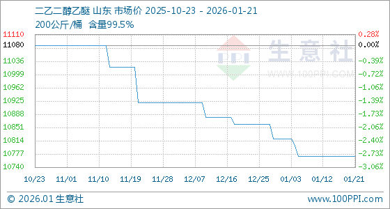 1月21日,生意社二乙二醇乙醚基准价为10771.43元/吨,与本月初(10820.00元/吨)相比,下降了0.45%。