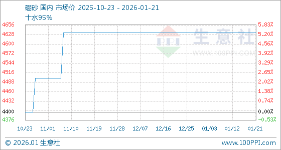 1月21日,生意社硼砂基准价为4633.33元/吨,与本月初持平。
