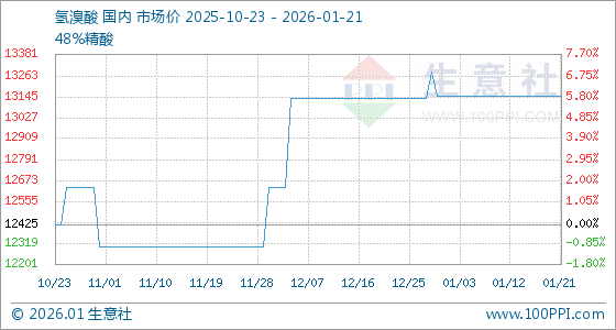 1月21日,生意社氢溴酸基准价为13150.00元/吨,与本月初持平。