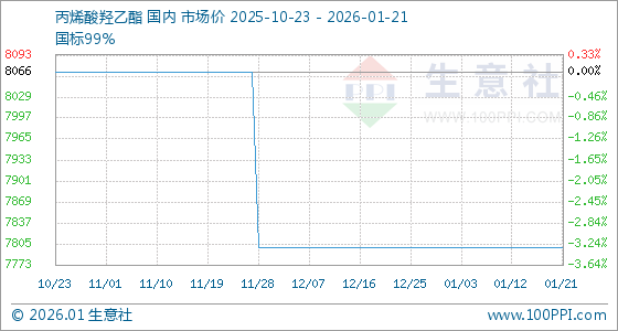 1月21日,生意社丙烯酸羟乙酯基准价为7800.00元/吨,与本月初持平。