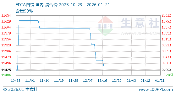 1月21日,生意社EDTA四钠基准价为11433.33元/吨,与本月初持平。