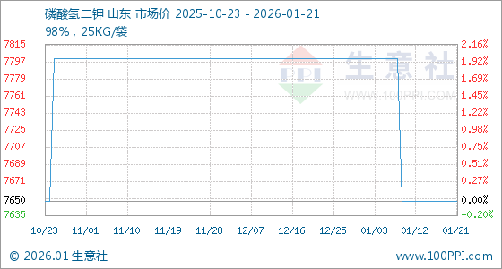 1月21日,生意社磷酸氢二钾基准价为7650.00元/吨,与本月初(7800.00元/吨)相比,下降了1.92%。