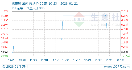 1月21日,生意社衣康酸基准价为11025.00元/吨,与本月初(11300.00元/吨)相比,下降了2.43%。