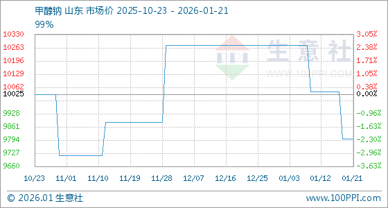 1月21日,生意社甲醇钠基准价为9800.00元/吨,与本月初(10275.00元/吨)相比,下降了4.62%。