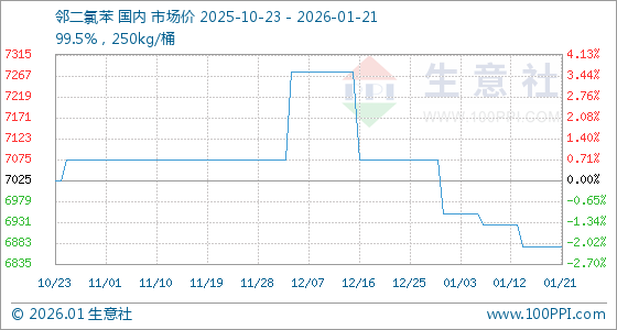 1月21日,生意社邻二氯苯基准价为6875.00元/吨,与本月初(6950.00元/吨)相比,下降了1.08%。