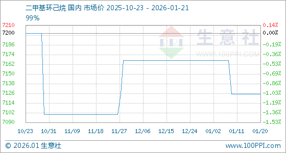 1月21日,生意社二甲基环己烷基准价为7125.00元/吨,与本月初(7166.67元/吨)相比,下降了0.58%。