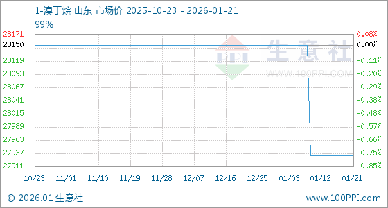 1月21日,生意社1-溴丁烷基准价为27933.33元/吨,与本月初(28150.00元/吨)相比,下降了0.77%。