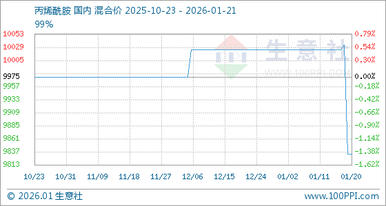1月21日,生意社丙烯酰胺基准价为9833.33元/吨,与本月初(10025.00元/吨)相比,下降了1.91%。
